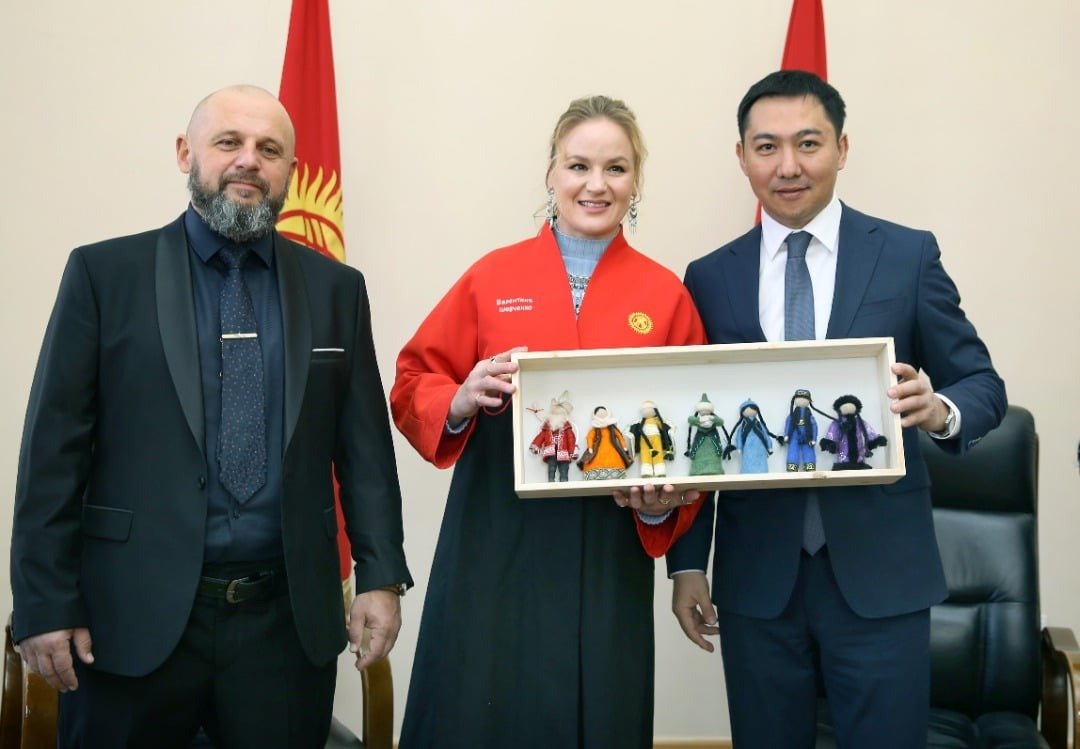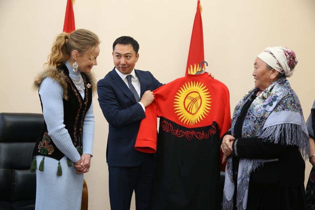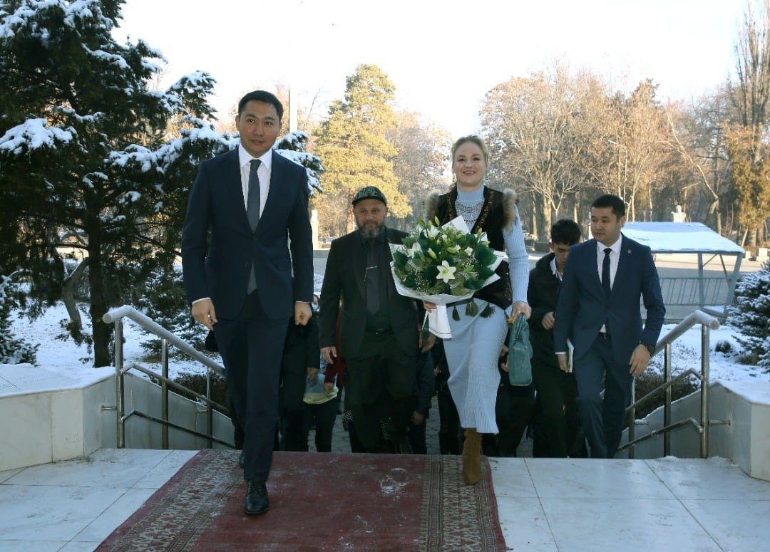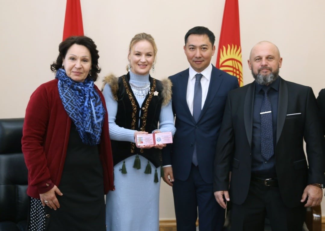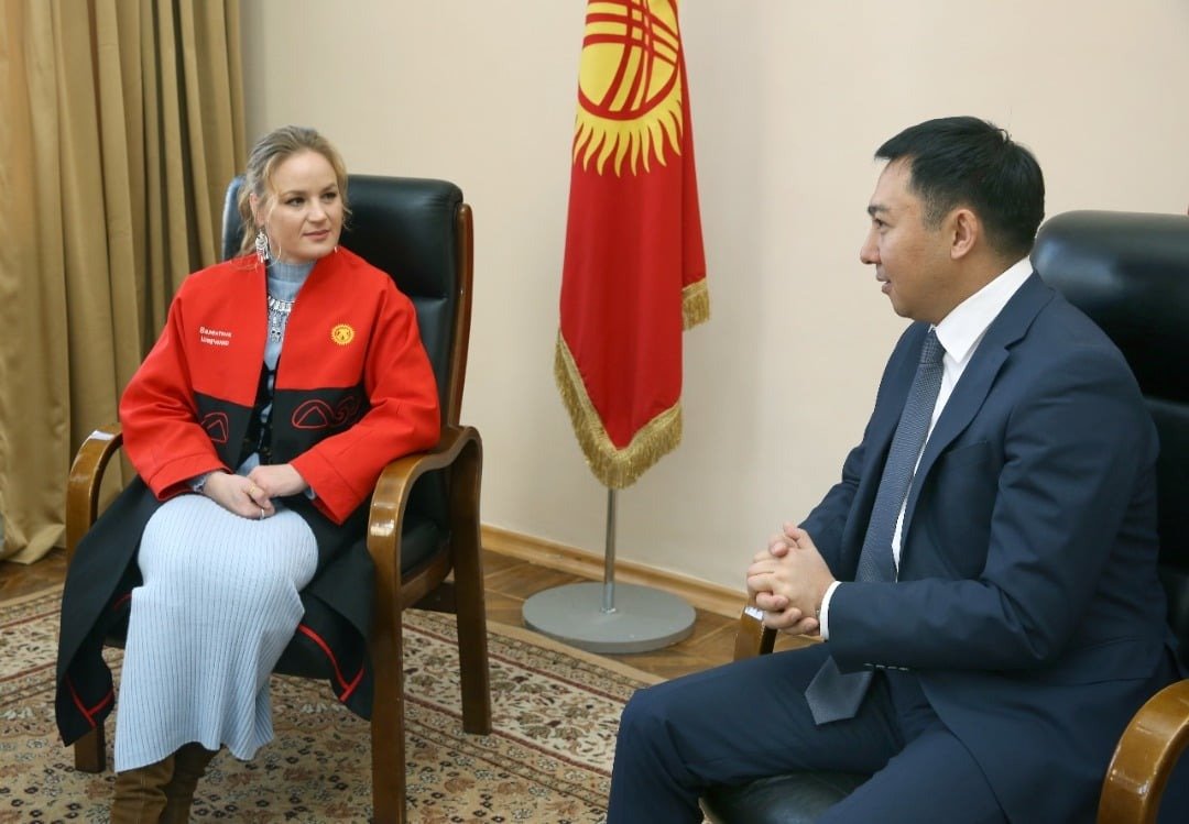 Бишкек, 28.12.21. /Кабар/. Министр культуры, информации, спорта и молодежной политики Азамат Жаманбаев вручил чемпионке UFC Валентине Шевченко значок «Отличник спорта» Кыргызстана.