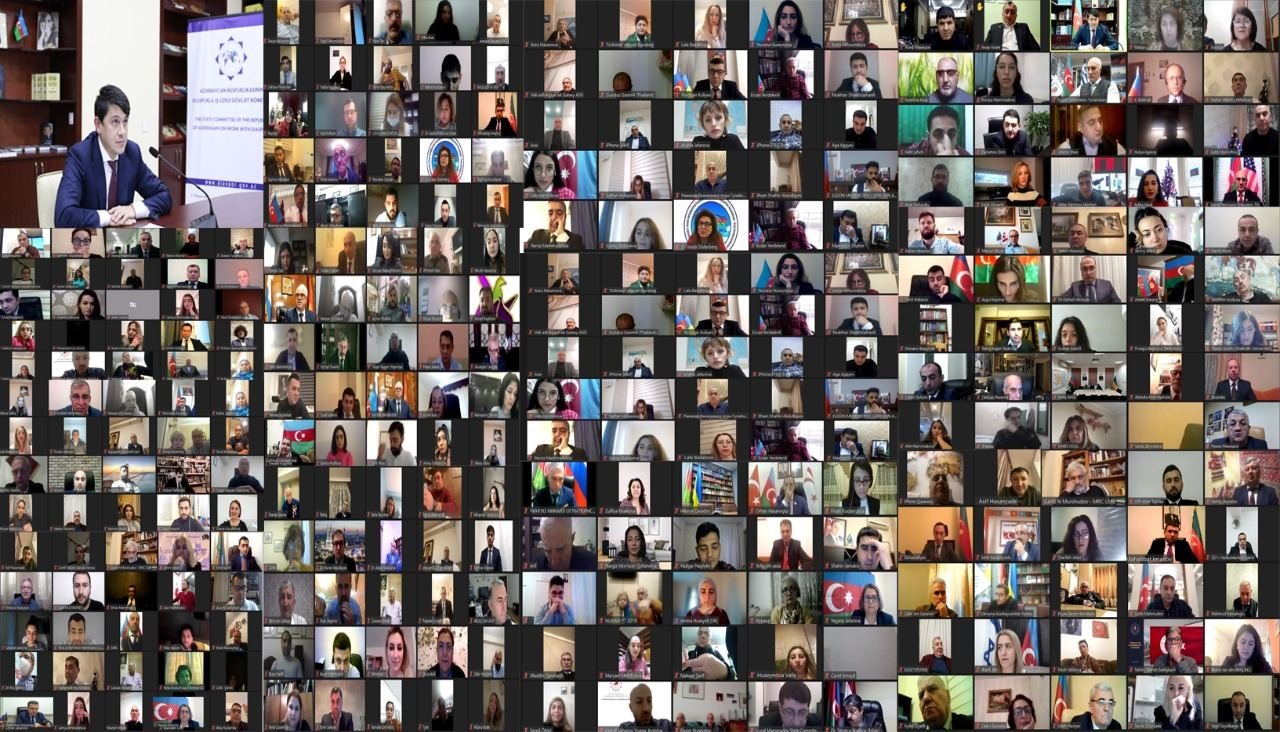После того, как председатель госкомитета Фуад Мурадов объявил видеоконференцию с участием 570 наших соотечественников из 67 стран открытой, минутой молчания была почтена светлая память шехидов, отдавших свои жизни в борьбе за освобождение от оккупации земель Родины, исполнен Государственный гимн Азербайджана.