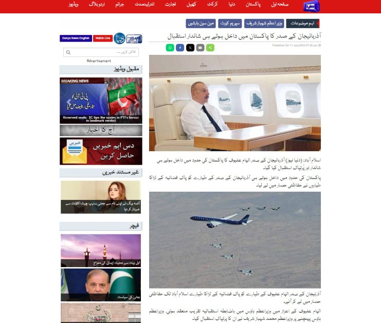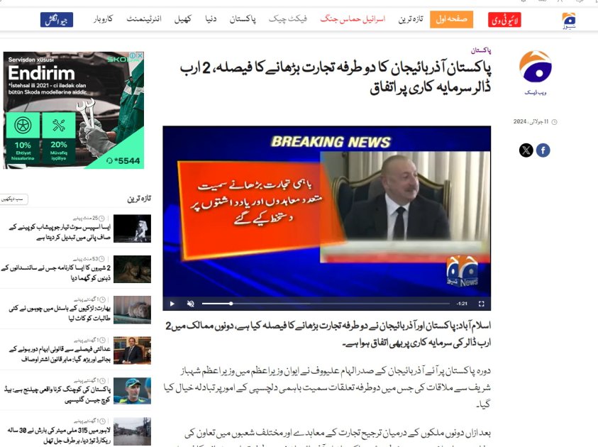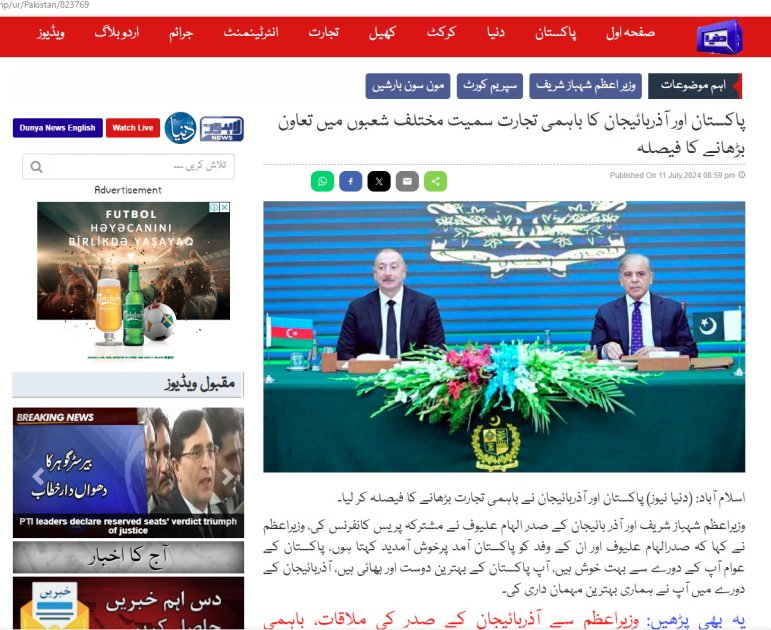 В газетах Urdu. Рoint и Urdu. Dunya News, издающихся на урду, а также на сайте телеканала Urdu. Dunya TV сообщается о встрече Президента Ильхама Алиева с Президентом Пакистана Асифом Али Зардари в расширенном составе в рамках государственного визита, о переговорах с Мухаммадом Шахбазом Шарифом и заявлениях лидеров, а также о подписанных документах.