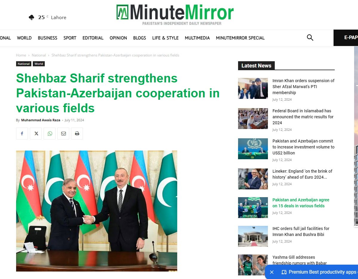 Как передает TurkicWorld, в статье под заголовком «Подписаны 15 документов, направленных на укрепление сотрудничества между Пакистаном и Азербайджаном», опубликованной на страницах пакистанской газеты The Express Tribune, издающейся на английском языке, сообщалось о подписанных между двумя государствами документах о сотрудничестве, церемония подписания которых проходила в присутствии Президента Азербайджанской Республики Ильхама Алиева и премьер-министра Исламской Республики Пакистан Мухаммада Шахбаза Шарифа. Было сообщено, что между министерствами иностранных дел двух стран подписаны Меморандум о взаимопонимании о сотрудничестве, соглашения по транзитной и преференциальной торговле, минеральным ресурсам и геологии, информационным технологиям и коммуникациям, науке и технологиям, малому и среднему предпринимательству и другим сферам, а также утверждена программа культурного обмена на 2024-2029 годы.