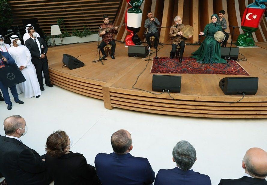 Как передает во вторник TurkicWorld, в ходе посещения павильона Президент Турции послушал азербайджанские песни в исполнении народного артиста Алима Гасымова и его дочери Фарганы Гасымовой. Затем он ознакомился с проделанной в павильоне подготовительной работой.