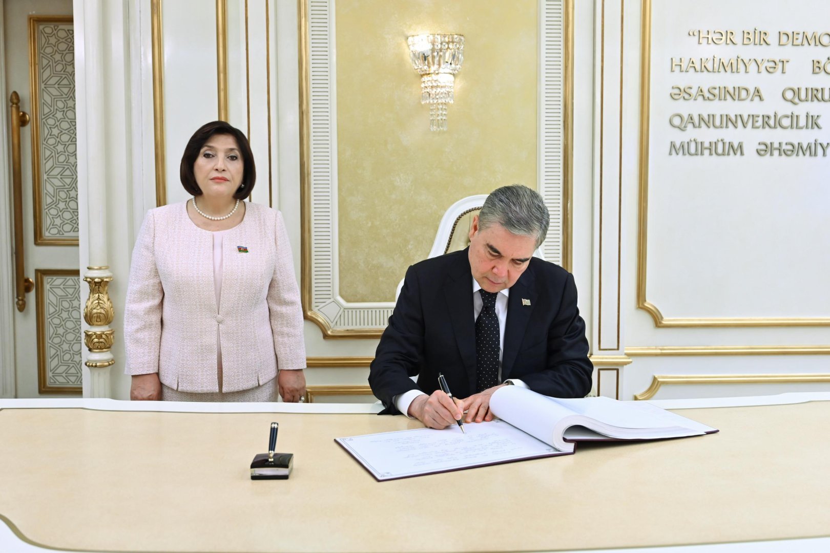 Как сообщили TurkicWorld в отделе прессы и связей с общественностью Милли Меджлиса, председатель Халк Маслахаты сначала ознакомился с залом пленарных заседаний Милли Меджлиса. Гости, пришедшие в мемориальный зал имени великого лидера Гейдара Алиева, ознакомились с экспонатами, отражающими различные периоды жизни и политической деятельности общенационального лидера азербайджанского народа Гейдара Алиева. Председатель Халк Маслахаты Туркменистана Гурбангулы Бердымухамедов оставил запись в Книге памяти.