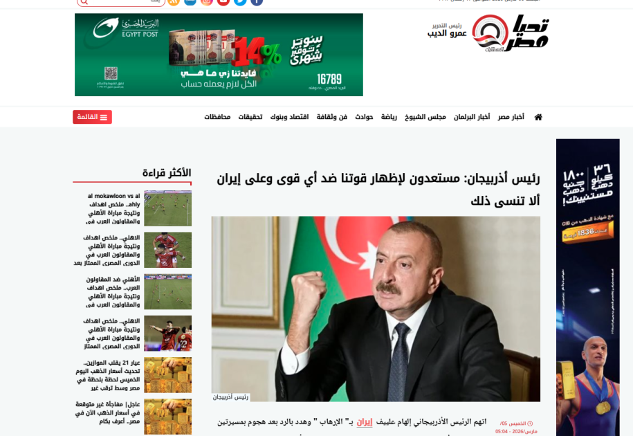 В материалах порталов Mc-Doualiya и Tahia Masr отмечалось, что Президент Азербайджана Ильхам Алиев в четверг обвинил Иран в совершении неспровоцированного акта террора и агрессии и дал указание армии подготовить и осуществить ответные меры. В публикациях также доведены до внимания информация Министерства обороны Азербайджана и вызов посла Ирана в МИД.