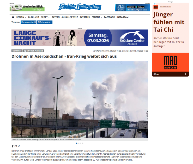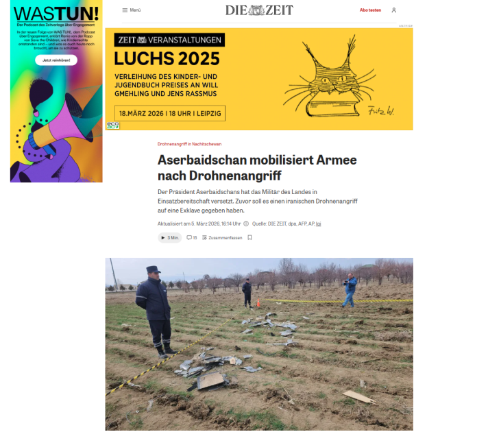 Как сообщает TurkicWorld/, немецкие медиа осветили основные моменты выступления главы государства. В материалах газет и порталов Morgenpost, Börsen News, FLZ. News, Tagesspiegel, Frankfurter Rundschau, Wirthschau Woche, Die Zeit, Ad Hoc News, Cash, Sarganserländer, Ostfriesen Zeitung отмечается, что в результате атаки беспилотников в Нахчыванской Автономной Республике Азербайджана были поражены аэропорт, здание школы и другие гражданские объекты. Подчеркивается, что на заседании Совета безопасности под председательством Президента Ильхама Алиева эта атака была решительно осуждена. Посол Ирана был вызван в Министерство иностранных дел Азербайджана в связи с инцидентом. Азербайджанский лидер назвал атаку Ирана «террористическим актом», после чего по его указанию Вооруженные силы Азербайджана были приведены в состояние высокой боевой готовности.