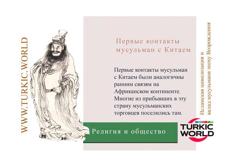 Кроме того, мусульмане включились в морскую торговлю между Персией и Китаем, существовавшую с доисламских времен. Персы-мусульмане даже основали собственное поселение на острове Хайнань. На суше самые ранние контакты между мусульманами и китайцами завязывались через поселения, которые мусульманские торговцы основывали в пределах западных границ Китая. Благодаря мусульманам объем торговли в Китае вырос, и именно они способствовали превращению китайской столицы Чанъань в «один из самых космополитичных городов мира». В Гуанчжоу мусульманское население процветало и выросло до такой степени, что император разрешил им иметь там собственного судью, оперировавшего исламским правом.