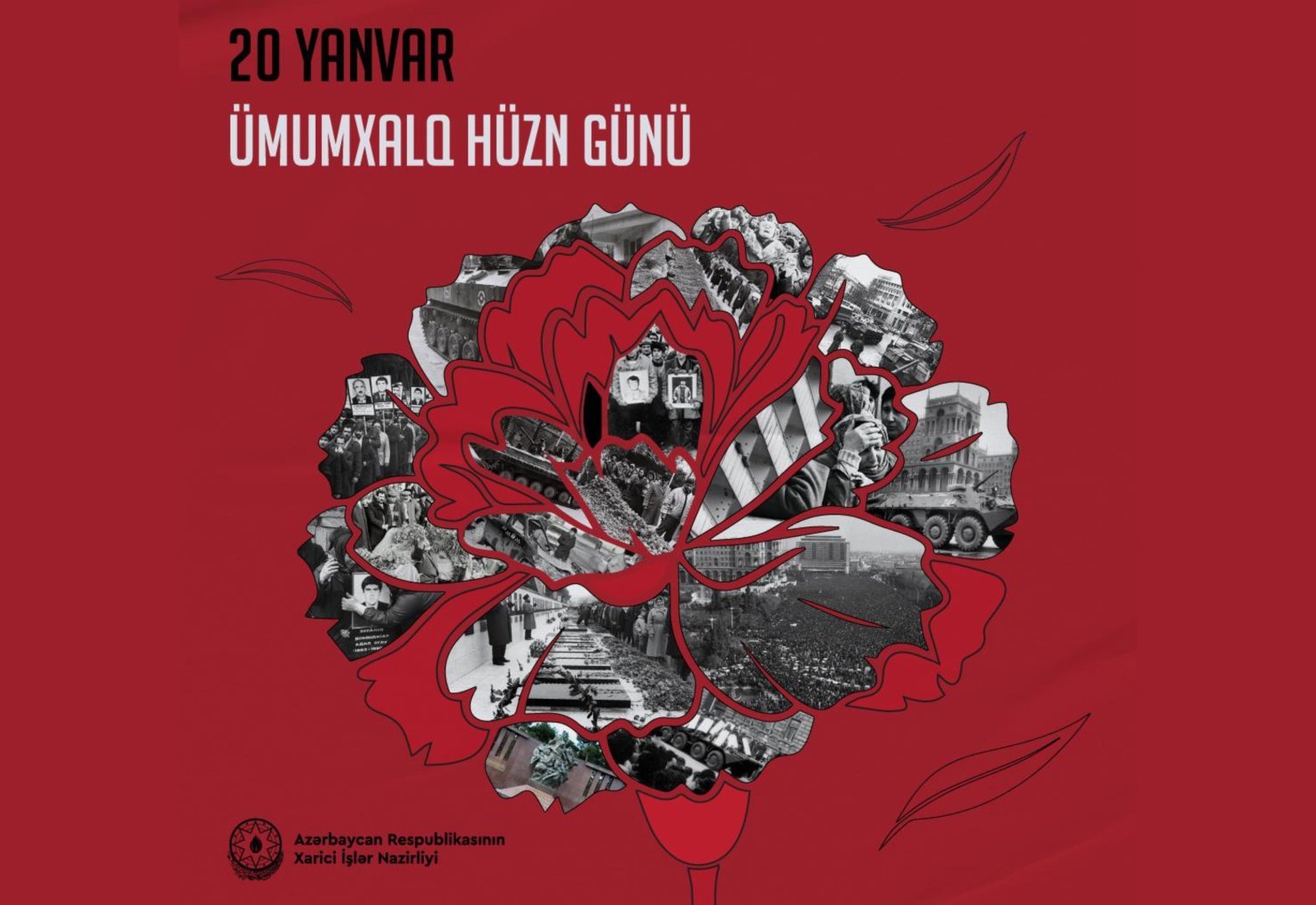 "Годовщина кровавой резни, совершенной бывшим СССР в целях подавления национально-освободительного движения азербайджанского народа в ночь с 19 на 20 января 35 лет назад, ежегодно отмечается в нашей стране как 20 января-День всенародной скорби. В День всенародной скорби – 20 января, являющимся днём глубокой печали, а также большой гордости в нашей современной истории, мы с глубокой благодарностью вспоминаем всех наших шехидов, отдавших свои жизни за независимость, суверенитет и территориальную целостность нашей страны.