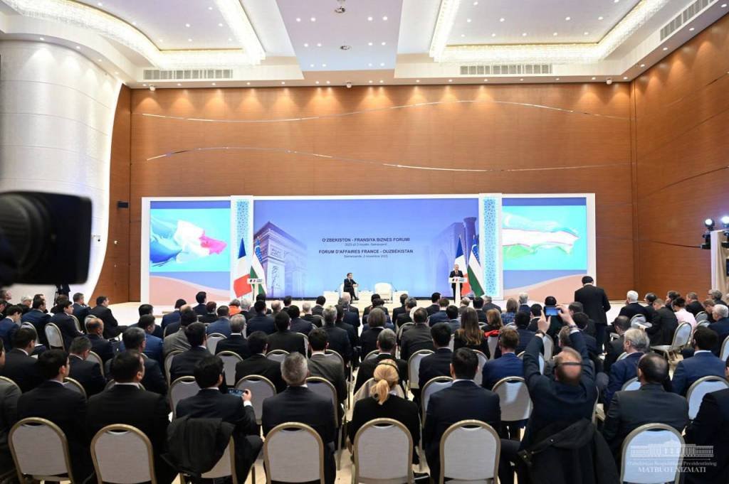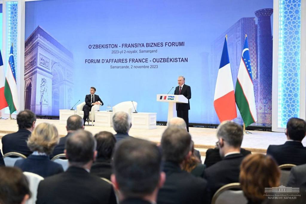 Uza. В рамках деловой программы официального визита Президента Французской Республики Эммануэля Макрона в Республику Узбекистан в городе Самарканде состоялся совместный бизнес-форум. В его работе приняли участие главы двух государств.
