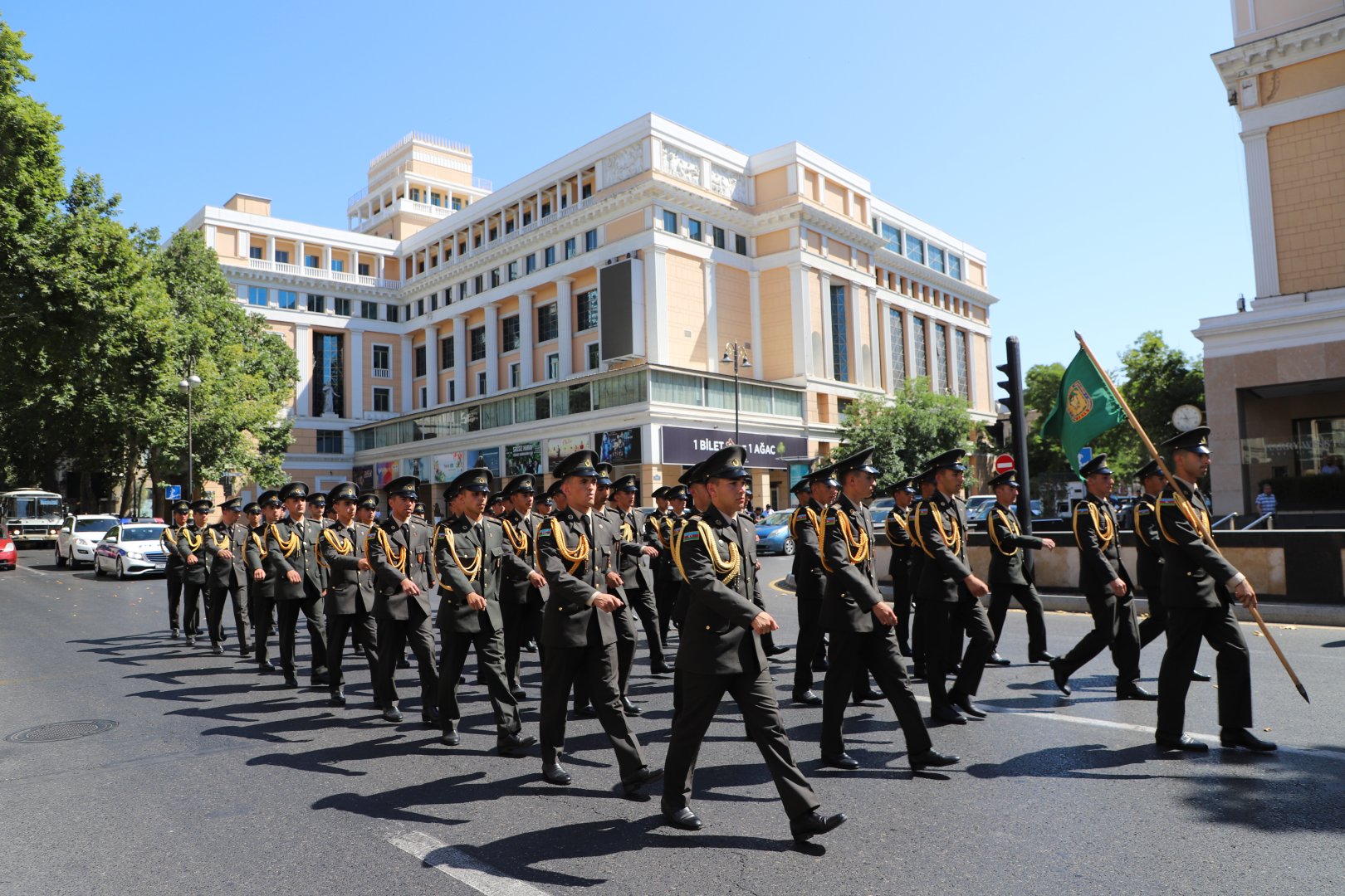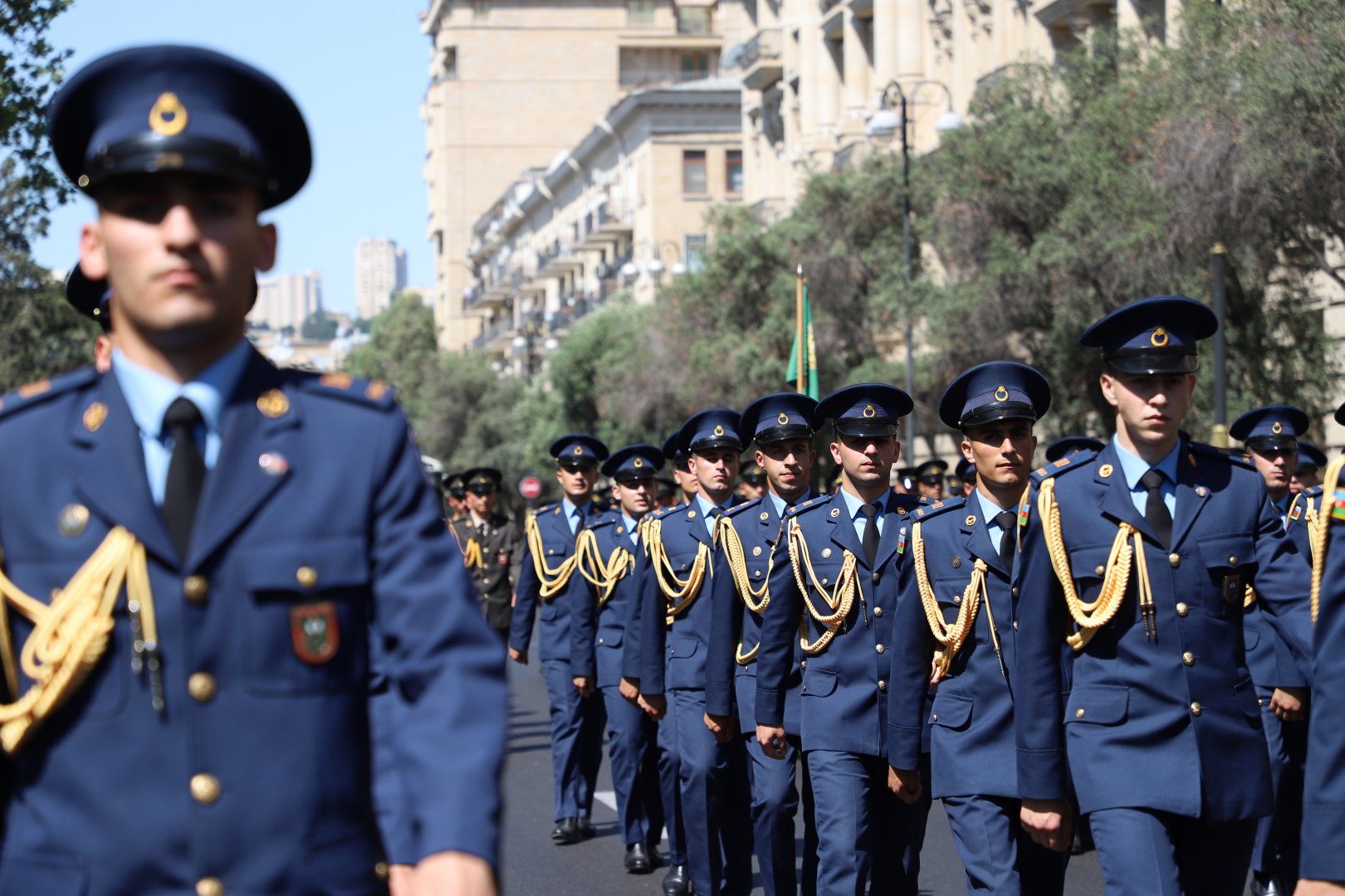 Bakü'de harp okulu öğrencileri ve subaylar, Türk ve Azerbaycan bayraklarıyla Bakü sokaklarında yürüyüş gerçekleştirdi.