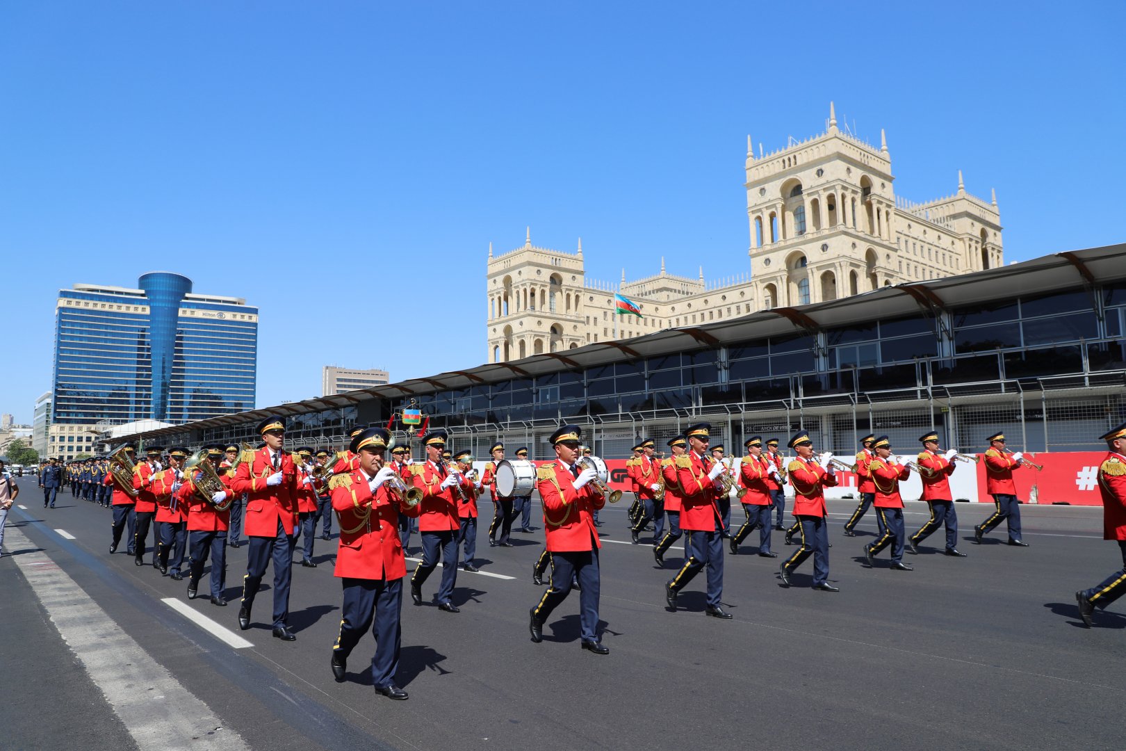 Azerbaycan Savunma Bakanlığına bağlı askeri bando ekipleri, yürüyenlere çeşitli marşlarla eşlik etti.