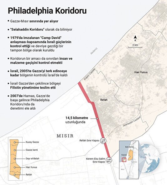 "Selahaddin Koridoru" olarak da bilinen ve Gazze ile Mısır sınırında yer alan koridor, 1979'da Mısır ile İsrail arasında imzalanan "Camp David" anlaşması kapsamında tampon bölgede yer alıyor. Koridor, 14,5 kilometre uzunluğunda, birkaç yüz metre genişliğinde ve Akdeniz'den başlayıp Kerem Ebu Salim Sınır Kapısı'na kadar uzanıyor.