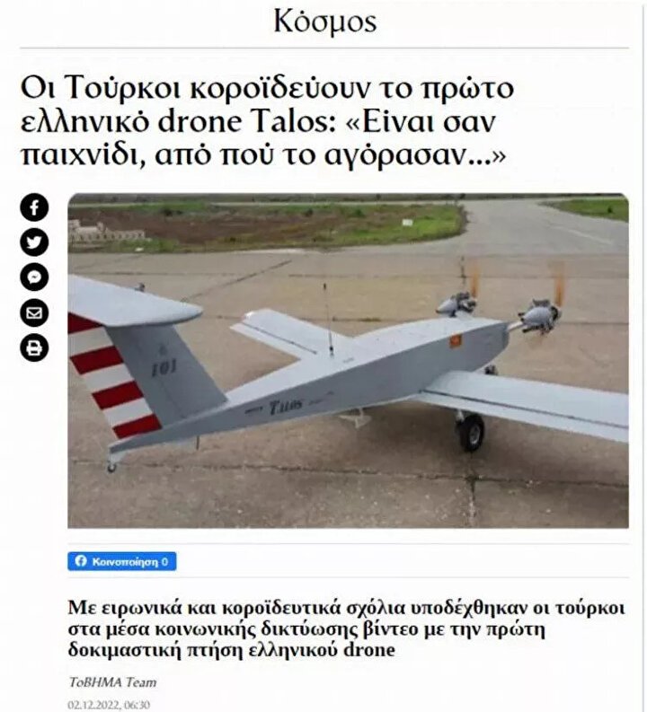 İlk sayfasında 'Türkler ilk Yunan drone'u Talos'la alay ediyor: Oyuncak gibi, nereden almışlar' başlığını atan To Vima gazetesi ise, test uçuşu videosu yayımlanan ilk Yunan insansız hava aracının Türkiye'de ironik ve alaycı yorumlarla karşılandığını bildiriyor. Habere göre, Türk basını Talos adı verilen insansız hava aracının test uçuşunu 'Daha çok bir oyuna benziyor' yorumuyla yeniden yayımladı.