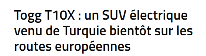TOGG'un ilk modeli T10X'in ön siparişe açılmasının ardından Türkiye'de olduğu gibi dünyada da konuşulmaya devam ediyor. En son Fransız basını TOGG'u mercek altına aldı. Fransız basınında TOGG'un tüm özellikleri ele alınarak yakında Avrupa yollarında olacağına dikkat çekildi.