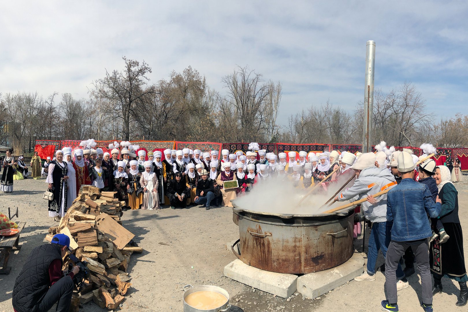 Başkent Bişkek'te bir restoranın bahçesinde Nevruz Bayramı için hazırlanacak sümölök tatlısı için halk sanatçıları ve vatandaşların katılımıyla kutlama etkinliği düzenlendi.