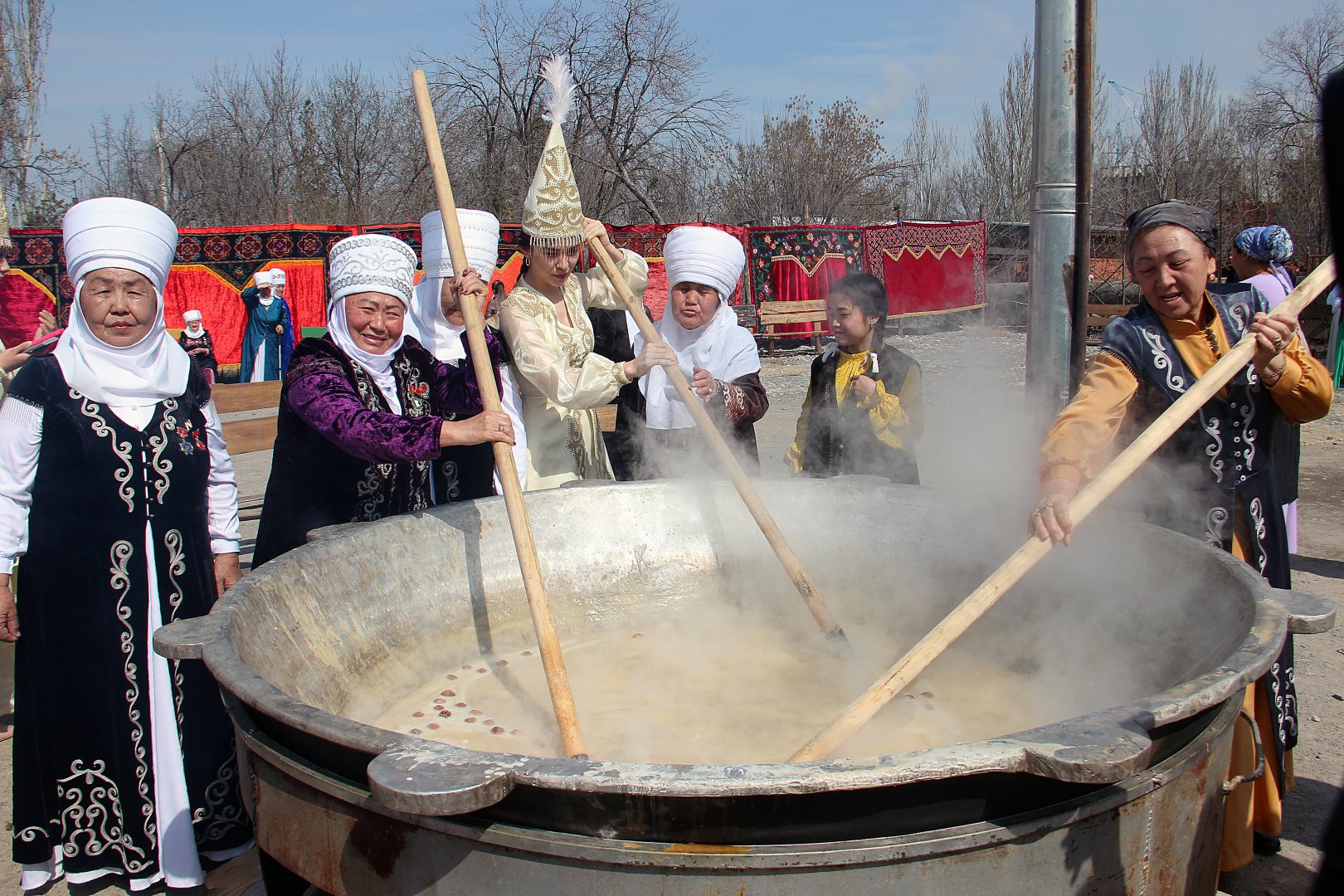 Kırgızistan'da Nevruz Bayramı'nın vazgeçilmez ikramlarından ve tarifi kuşaktan kuşağa aktarılan bolluk ve bereketin simgesi "sümölök" tatlısı pişirilmeye başlandı.