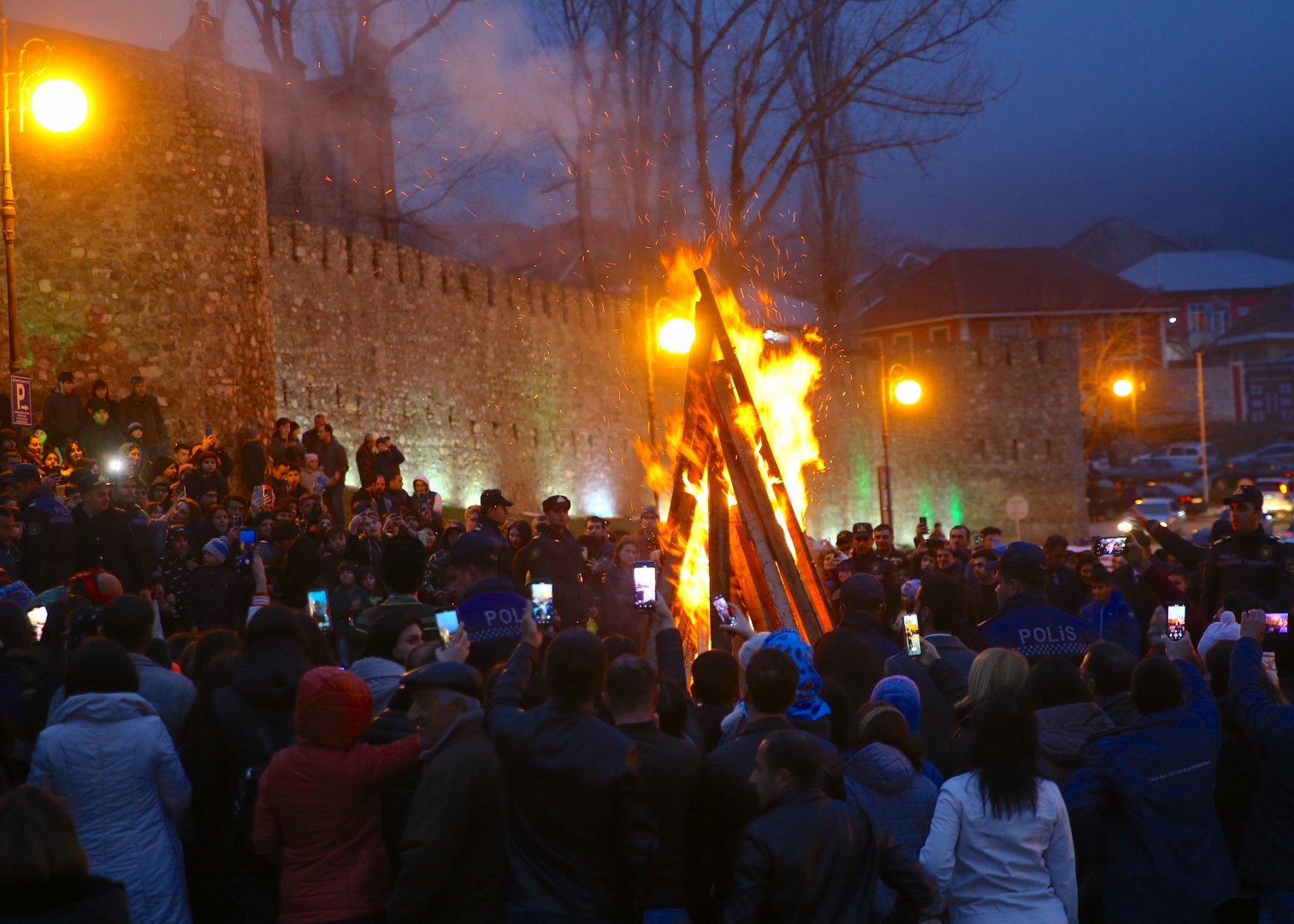 Pehlivanların ağır taşlarla yaptığı gösterilerin izlendiği, milli dansların yapıldığı, halayların çekildiği kutlamalar, nevruz ateşinin yakılmasıyla devam etti.