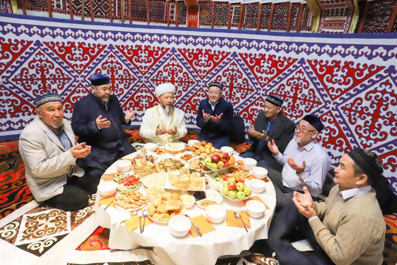 Bayram dolayısıyla geleneksel Kazak çadırlarının kurulduğu cami avlularında renkli etkinlikler düzenleniyor. Aynı sofranın etrafında bir araya gelen Kazaklar, “Aytın kabul olsun.” diyerek bayramlaşıyor.