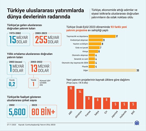 Türkiye, ekonomide yaşanan gelişmeler ve siyasi istikrarla uluslararası doğrudan yatırımların da odak noktasında Alibaba'dan Amazon'a, Huawei'den PepsiCo'ya kadar dünyanın önde gelen firmaları yeni yatırımlara yöneldi. 2002'de 5 bin 600'den fazla uluslararası şirket faaliyet gösterirken bu rakam 2023'te 80 bini aştı. Bu yılın 9'uncu yılında 93 yeni yatırım projesi geldi. İlk etapta 17 projeyle taşıma ve depolama, ikinci sırada ise 9 projeyle endüstriyel ekipman sektörü yer aldı. ABD, Almanya, Fransa, İtalya, Çin (Hong Kong dahil), Japonya, Hollanda ve Birleşik Arap Emirlikleri söz konusu yatırımlarda öne çıkan ülkeler arasında yer aldı.