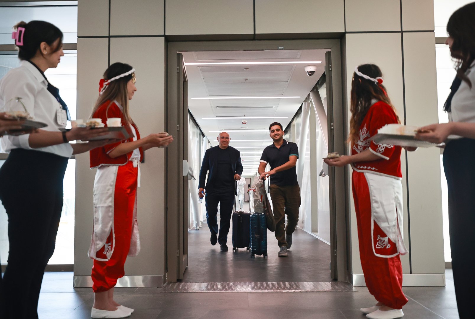 Yöresel kıyafetli hostesler de uçaktan inen yolculara çeşitli ikramlarda bulundu.