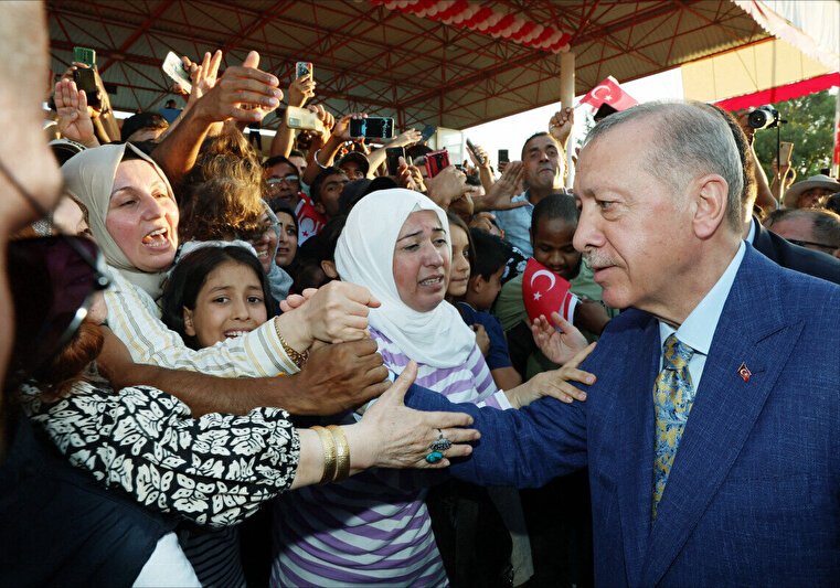 Tören sonrası tribüne giden Erdoğan'a vatandaşlar sevgi gösterisinde bulundu. Bu sırada bir kadın Erdoğan'ın elini öperek sevgisini gösterdi.