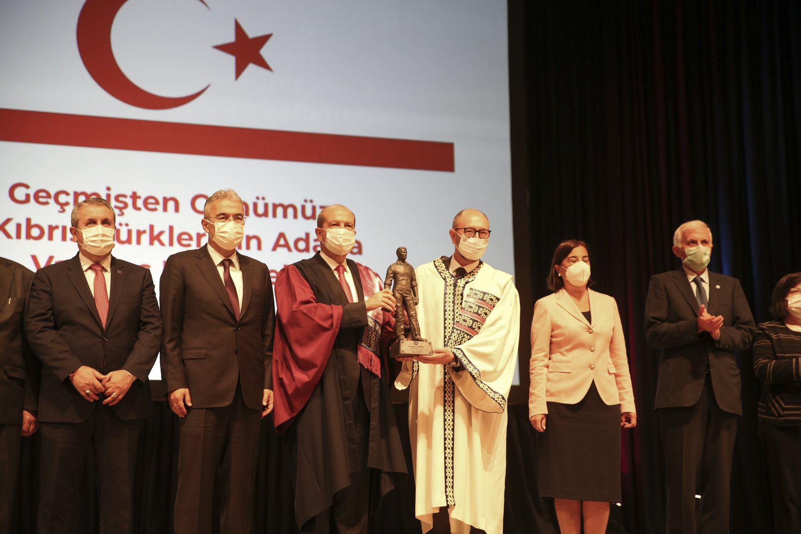 Anadolu Üniversitesinin (AÜ) 2021-2022 Akademik Yıl Açılış Töreni'nde katılan ve fahri doktora unvanı verilen Tatar'a cübbesini AÜ Rektörü Prof. Dr. Fuat Erdal giydirdi.