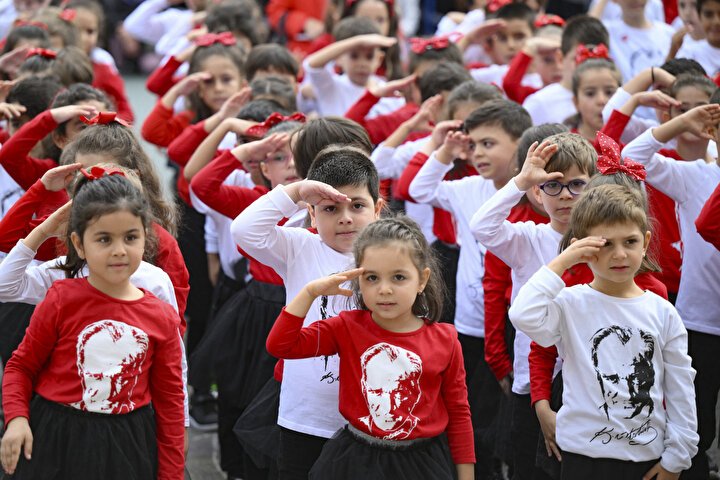 İstanbul'da ilkokul öğrencileri, giydikleri 100. yıl tişörtleriyle Cumhuriyet Bayramı'nı kutladı.