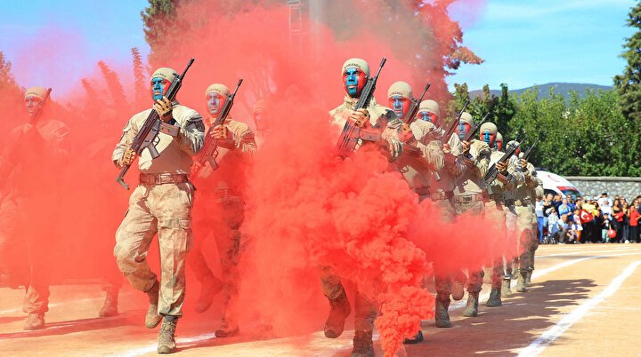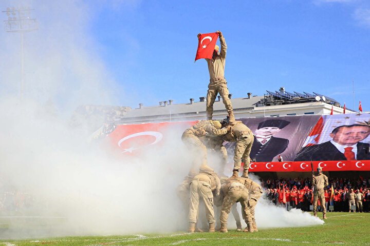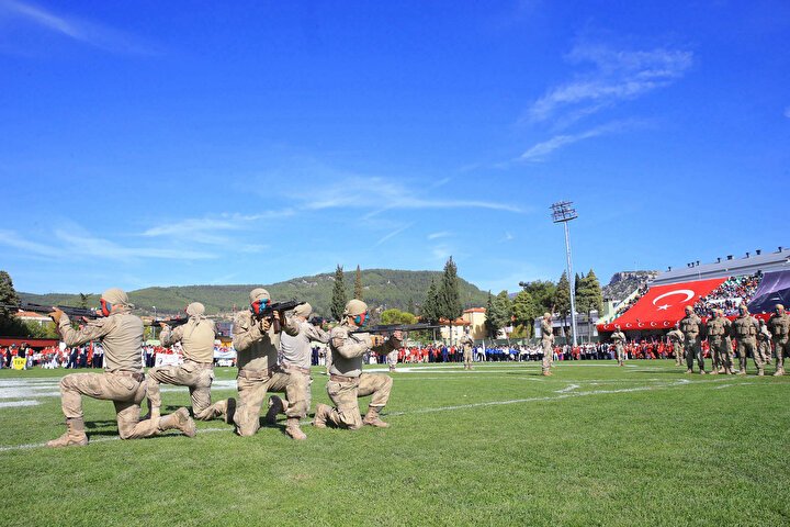 Muğla'da, 29 Ekim Cumhuriyet Bayramı ve Cumhuriyet'in 100. yılı kutlamaları kapsamında Atatürk Stadyumunda tören düzenlendi. Törende Muğla İl Jandarma Komutanlığı Zıpkınlar Komando Taburu gösteri gerçekleştirdi.