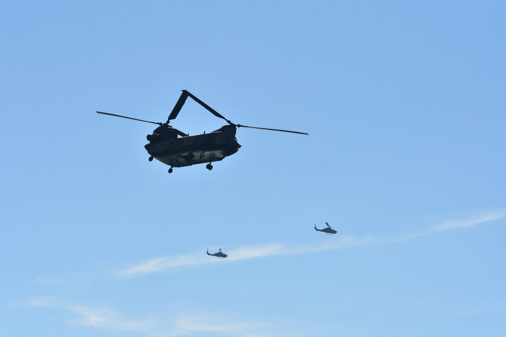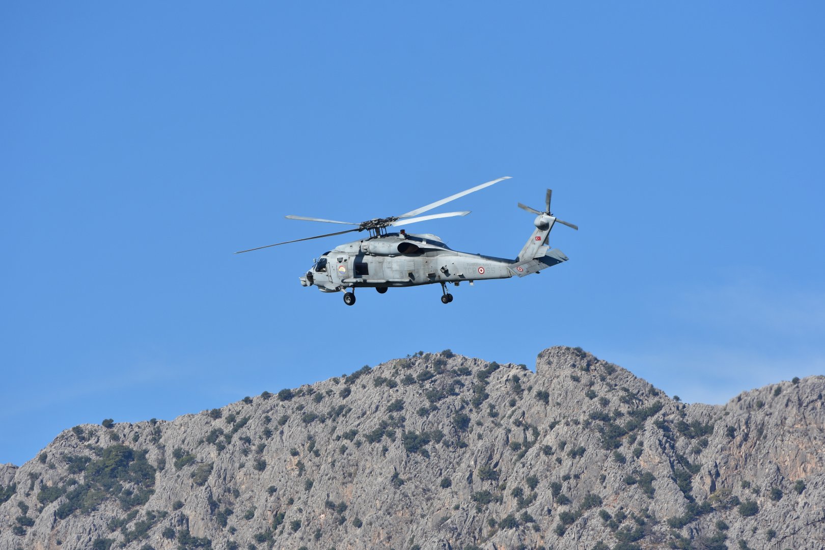 Gemiye inen askeri birliklerin Türk ve Azerbaycan bayrakları açmalarının ardından helikopterler, Oramiral Tatlıoğlu'nu selamladı.