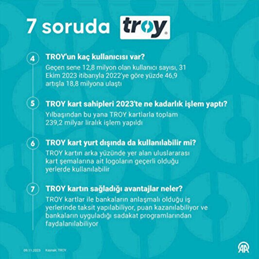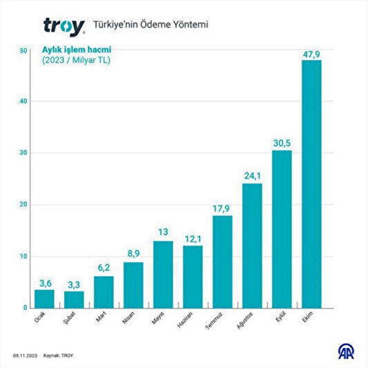 TROY logolu kartlar ile gerçekleşen alışveriş hacmi bu yıl, ekimde ocak ayına göre yaklaşık 14 kat artarak 48 milyar lira seviyesine yükselirken, 2023 başından itibaren TROY kartlar ile toplam 239,2 milyar liralık işlem yapıldı.