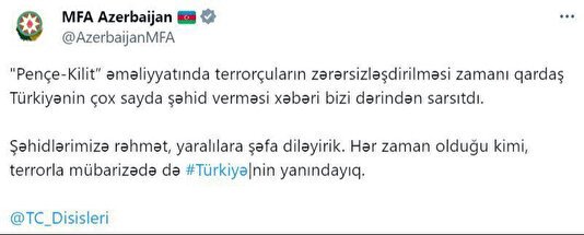 Azerbaycan Dışişleri Bakanlığı'ndan yapılan açıklamada, “Kardeşimiz Türkiye'nin Pençe-Kilit Harekatı'nda teröristlerin etkisiz hale getirilmesi sırasında şehit verdiği haberi bizi derinden sarstı. Şehitlerimize rahmet, yaralılarımıza şifa diliyoruz. Terörle mücadelede her zaman olduğu gibi Türkiye'nin yanındayız” denildi.