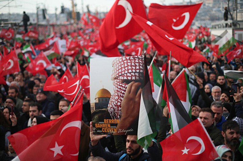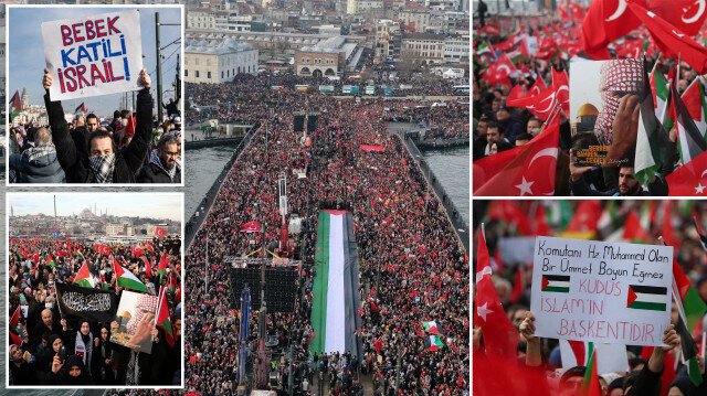 Topraklarımızda gözü olanların, Arz-ı Mevud safsatasıyla milyonların kanına girenlerin gözlerini çıkarmak için bizler kayıtsız kalamayız. On binlerce şehidimizin katilleri aynı olduğu için kayıtsız kalamayız. Yılın ilk günün sabahında Galata Köprüsü'nde, yüzbinler, biliyoruz ki terörle mücadele yıllar boyunca verdiğimiz şehitlerimizi katillerinin kim olduğunu biliyoruz. Filistin soykırımına sebep olanların ve şehitlerimiz katillerinin aynı olduğunu bizler biliyoruz. Ancak birlik olduğumuzda zulümlere karşı güçlü olabiliriz. Mülteci düşmanlarını körükleyenlerin de kimle olduğunu biliyoruz. Ayasofya'nın zincirlerinin kırılması Kudüs'ün mescidi aksanın zincirini kırılmasının ilk adımı olduğunu biliyoruz.