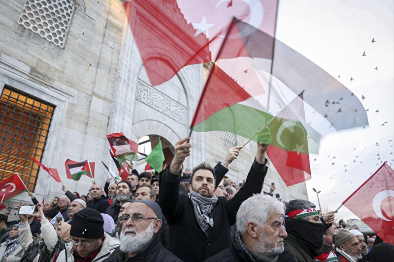 "Şehitlerimize Rahmet, Filistin'e Destek, İsrail'e Lanet" yürüyüşü için yüz binlerce kişi sabah namazında bir araya geldi.