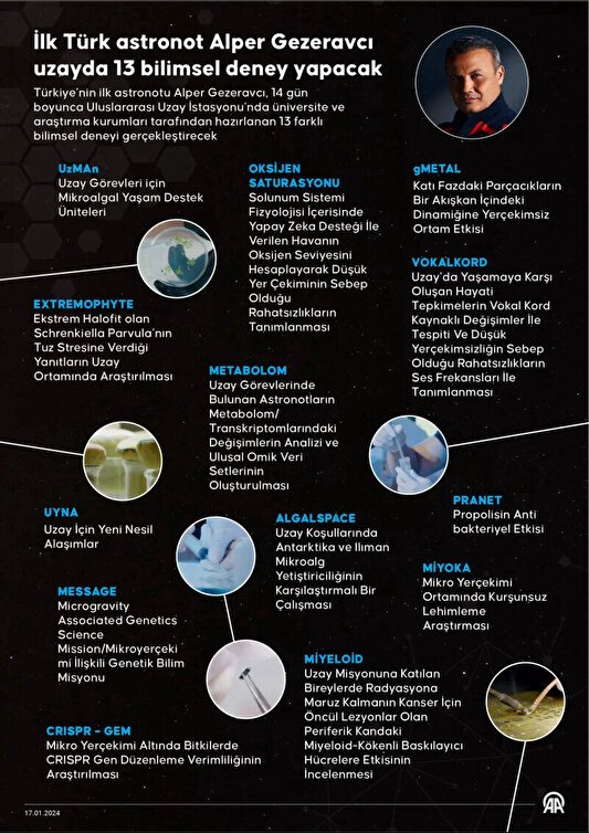 Türkiye'nin ilk astronotu Alper Gezeravcı, 14 gün boyunca Uluslararası Uzay İstasyonu'nda (ISS) çeşitli üniversite ve araştırma kurumları tarafından hazırlanan 13 farklı bilimsel deneyi gerçekleştirecek. Gezeravcı, Uluslararası Uzay İstasyonu'ndaki ilk deneyi kapsamında, tuz stresine maruz bırakılan bitkileri araştıracak.