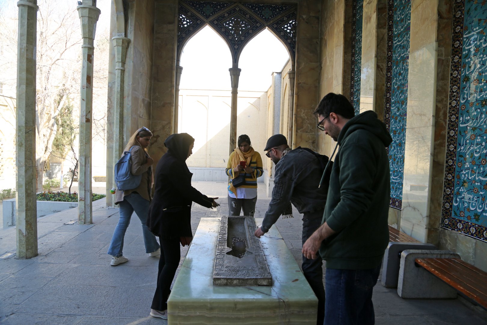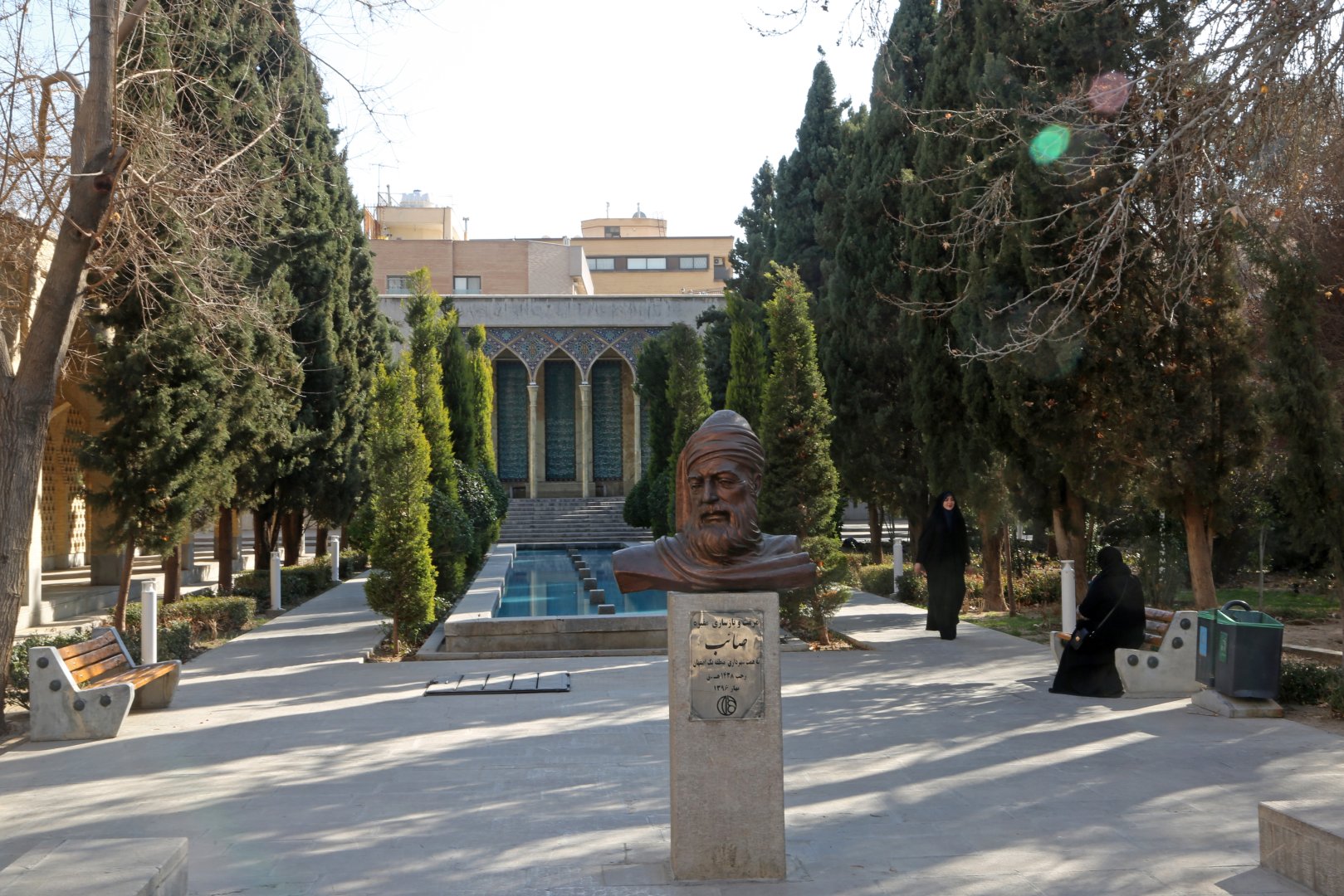 İsfahan’ın tarihi dokusuyla uyumlu bir şekilde, büyük bir bahçenin içinde yer alan makberin içindeki çiçekler, yeşil alanlar ve ortada yer alan havuz, türbeye ayrı bir güzellik katıyor. Çevresindeki geniş bahçe, hem mimari hem de doğal güzellikleriyle dikkati çekiyor.