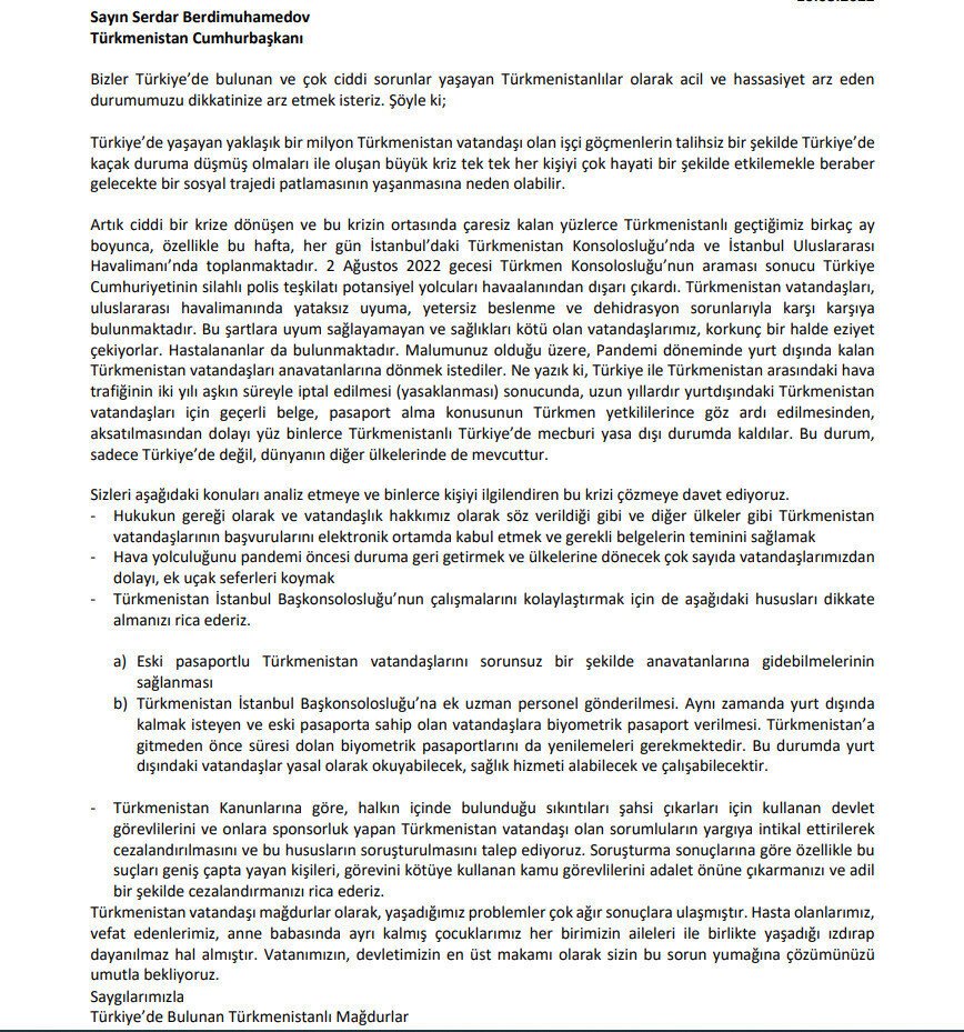 Türkiye'de yaşayan ve konsolosluğun resmi işlemlerini yapmaması sebebiyle mağdur olan, ülkelerine gidemeyen ve daha birçok sorunla yüzleşen Türkmenistanlılar, mağduriyetlerinin giderilmesi adına avukatları Gülden Sönmez ve bazı STK temsilcileriyle birlikte İstanbul Türkmenistan Konsolosluğu'na giderek Cumhurbaşkanı Serdar Berdimuhammedov'a bir mektup göndermek istedi ancak darp edildiler.