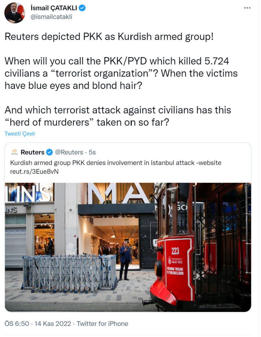 İçişleri Bakan Yardımcısı İsmail Çataklı, İstiklal Caddesi'ndeki saldırıyla ilgili haberinde terör örgütü PKK'dan 'Kürt militan grup' olarak bahseden Reuters haber ajansına tepki gösterdi. Söz konusu haberi alıntılayan Çataklı, "5 bin 724 sivili öldüren PKK/PYD'ye ne zaman 'terör örgütü' diyeceksiniz? Kurbanların mavi gözleri ve sarı saçları varken mi?" ifadelerini kullandı.