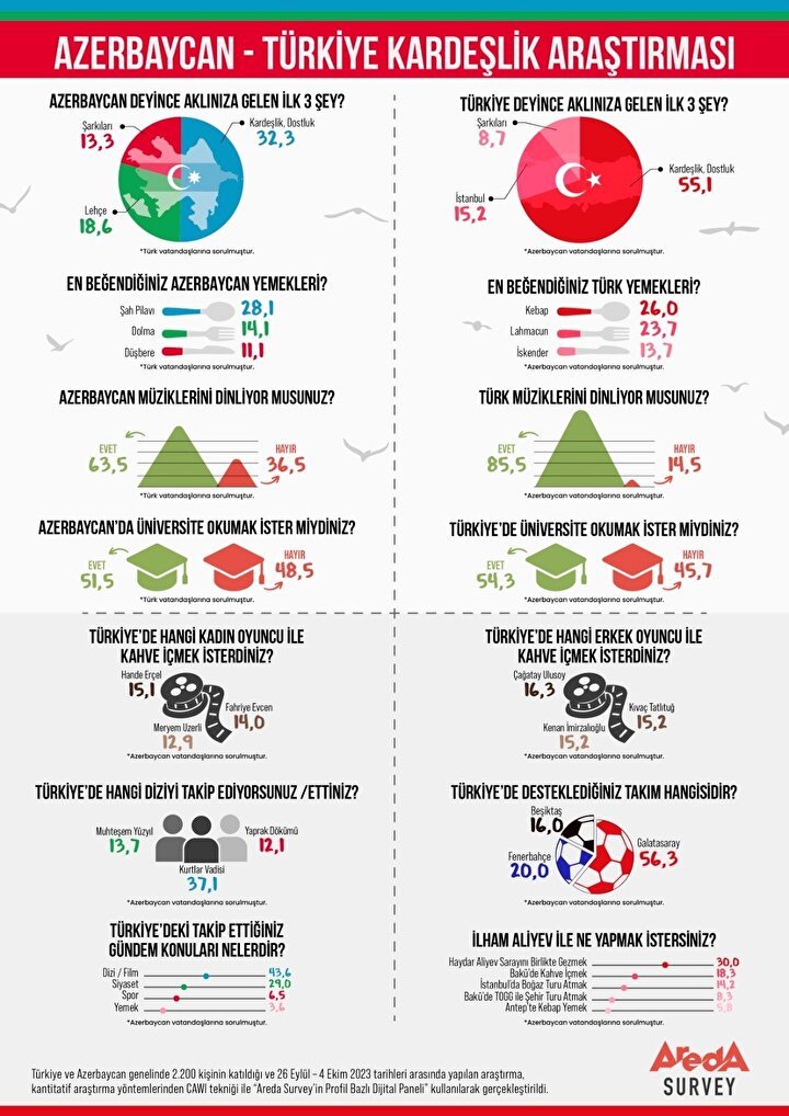 Araştırma şirketi Areda Survey, Türkiye ve Azerbaycan’da eşzamanlı olarak 2 bin 200 kişinin katılımıyla Türkiye-Azerbaycan ilişkilerine dair bir araştırmaya imza attı. Araştırmada, Azerbaycan halkının en sevdiği Türk yemeği, en çok izlenen Türk dizisi, Azerbaycan halkının "Aliyev ile ne yapmak istersiniz?" gibi sorular yönetildi. İşte Azerbaycan vatandaşlarının Türkiye’deki ilk tercihleri...