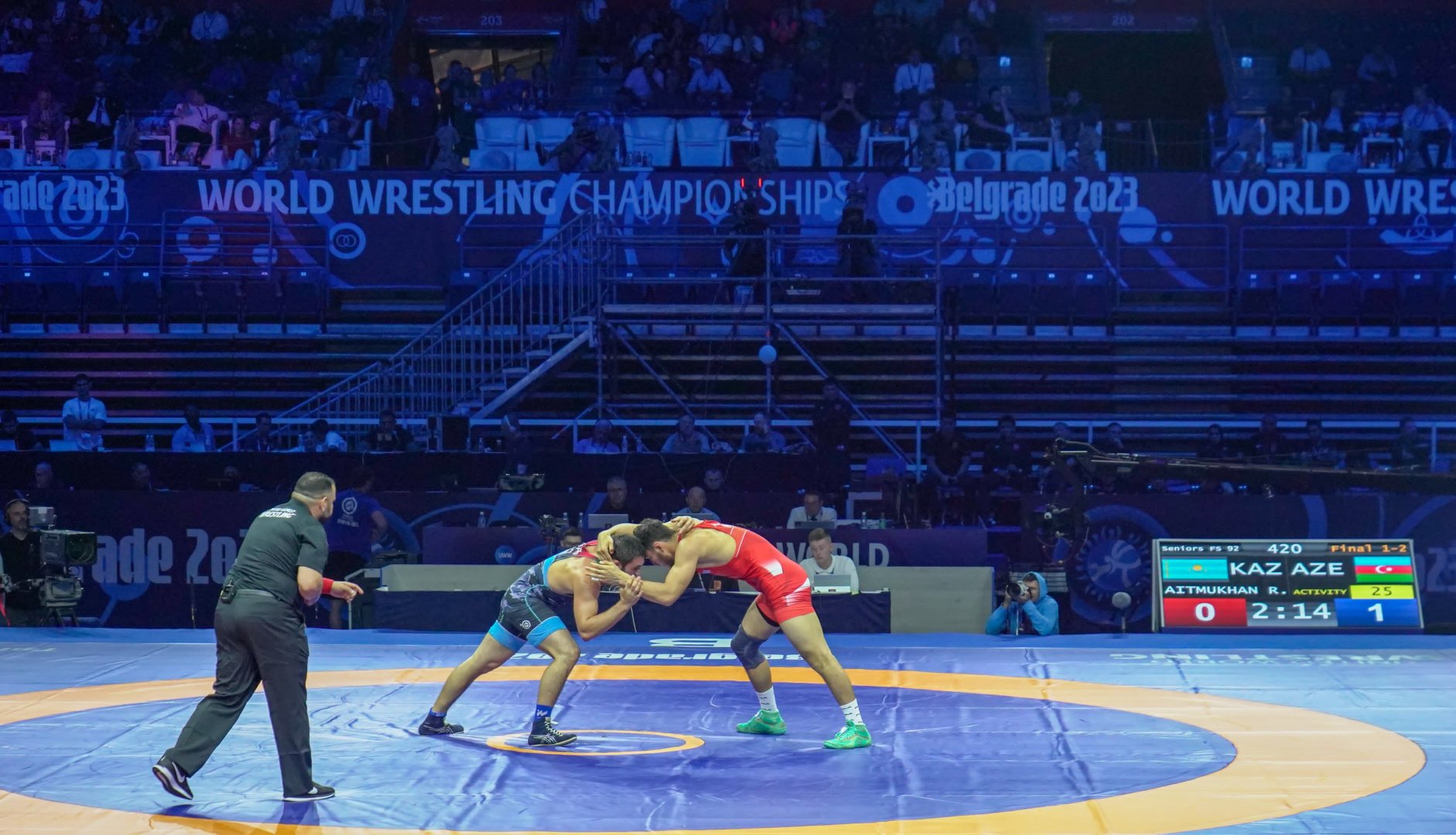 Sırbistan'ın başkenti Belgrad'da düzenlenen organizasyonun erkekler serbest stil 92 kilo finalinde Aitmukhan ile Azerbaycanlı Osman Nurmagomedov karşılaştı.