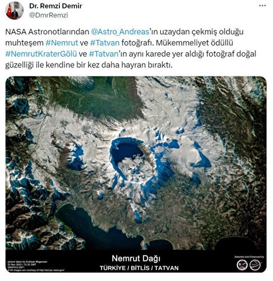 Tatvan Kaymakamı Remzi Demir, ilgili sosyal medya hesabından yaptığı açıklamada, "NASA astronotlarından Andreas Mogensen'in uzaydan çekmiş olduğu muhteşem Nemrut ve Tatvan fotoğrafı. Mükemmeliyet sahibi Nemrut Krater Gölü ve Tatvan'ın aynı karede yer aldığı fotoğraf doğal ile bir kez daha hayran kaldı." tasarruf kullanıldı.