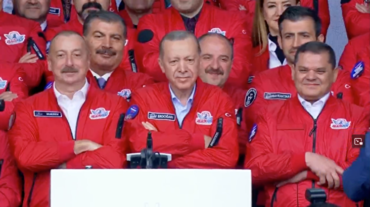 Aliyev konuşmasını bitirdikten sonra sahneye gelen Cumhurbaşkanı Recep Tayyip Erdoğan- TEKNOFEST'in bu sene başka bir güzel olduğunu vurgulayarak Aliyev ve Libya Başbakanına teşekkür etti.