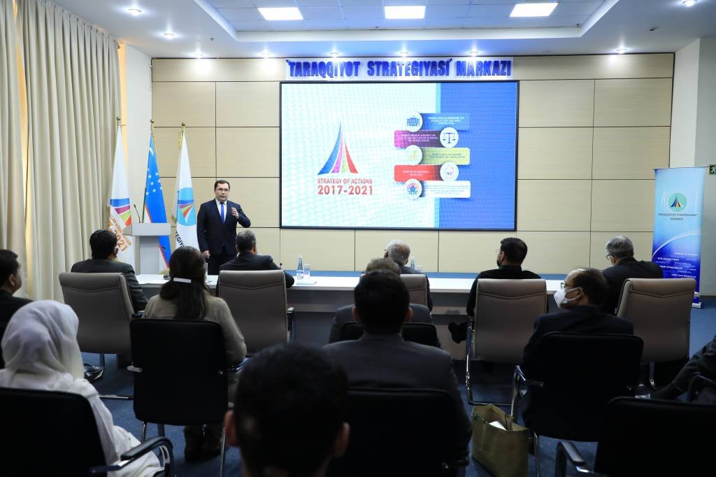 “Taraqqiyot strategiyasi” markazida O‘zbekistonda amaliy tashrif bilan bo‘lib turgan Pokiston Davlat siyosati oliy maktabi tinglovchilari uchun O‘zbekistonda Harakatlar strategiyasi doirasida amalga oshirilgan islohotlar yakunlari hamda 2022–2026 yillarga mo‘ljallangan Yangi O‘zbekistonning taraqqiyot strategiyasida ko‘zda tutilgan maqsadlarning mazmun-mohiyatiga qaratilgan taqdimot bo‘lib o‘tdi.